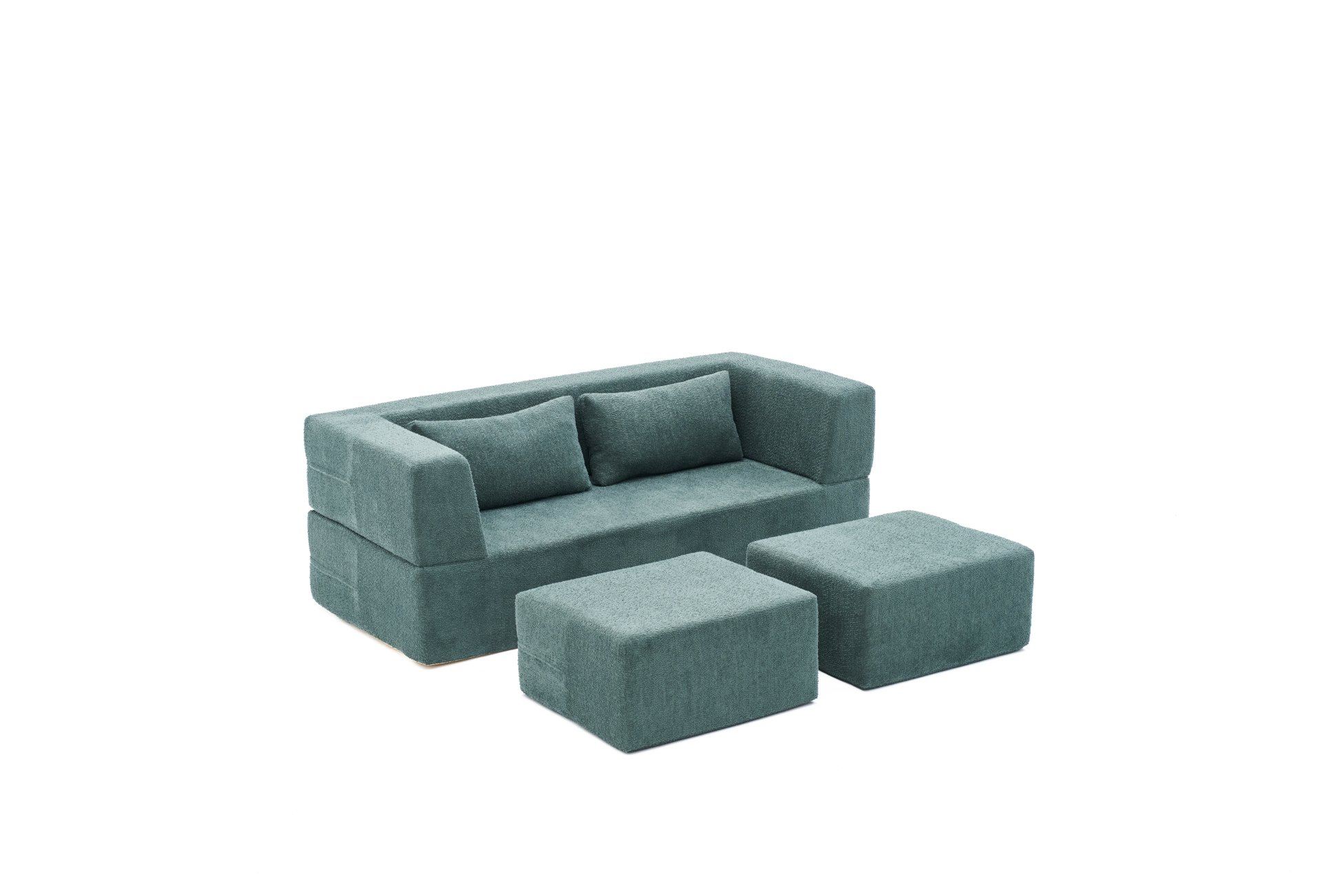 NORDVÄRK Pirgos 2 pers. sovesofa, m. 2 puffer – grøn chenille stof